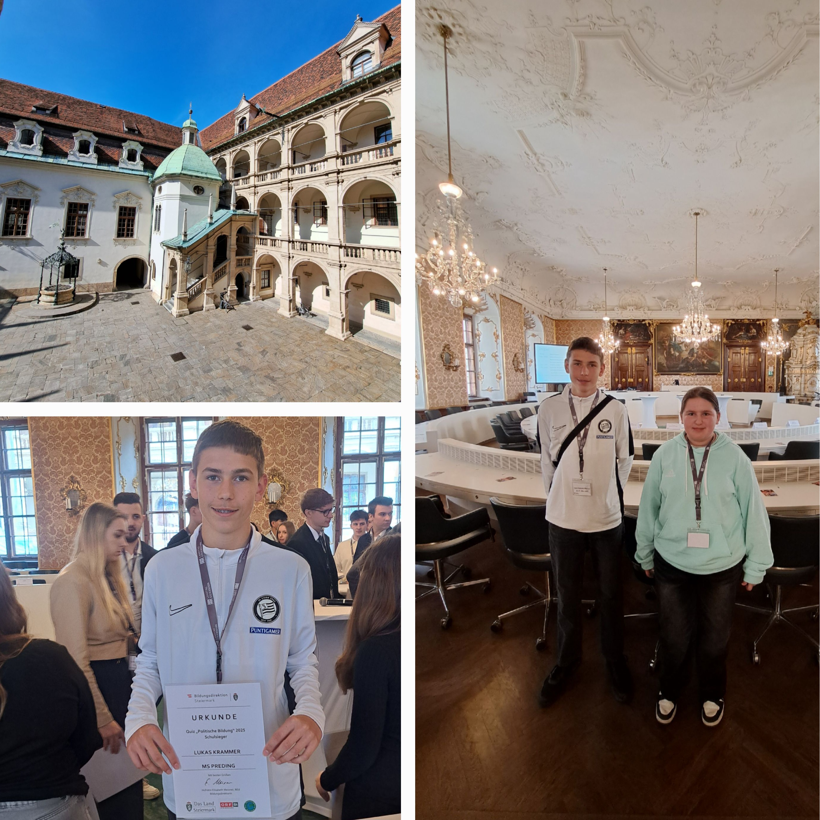 Am 27. März 2025 fand im Landhaus in Graz der Landeswettbewerb im Politischen Quiz statt. Mit dabei waren Eve Marko und Lukas Krammer aus der 4a-Klasse, die sich zuvor in der schulischen Vorausscheidung durchgesetzt hatten – dabei konnte sich Lukas als Schulsieger behaupten.